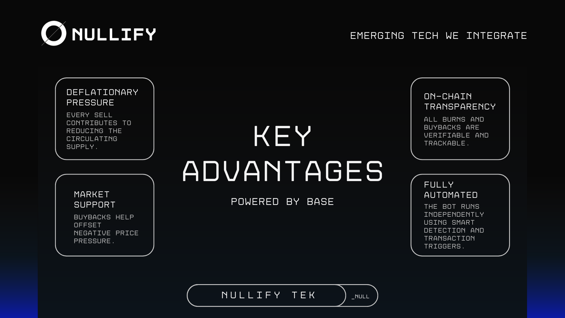 Holders benefit from enhanced stability through reduced volatility, potential value appreciation driven by consistent buybacks, complete transparency with blockchain-recorded transactions, and rewards for long-term commitment to the $NULL ecosystem.