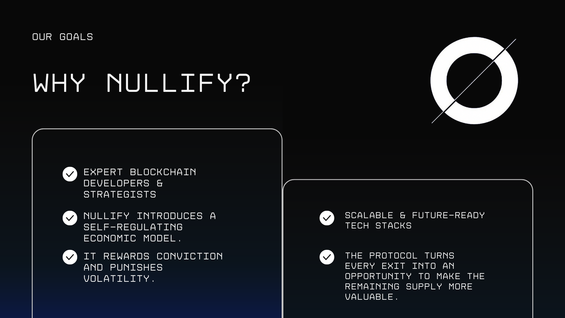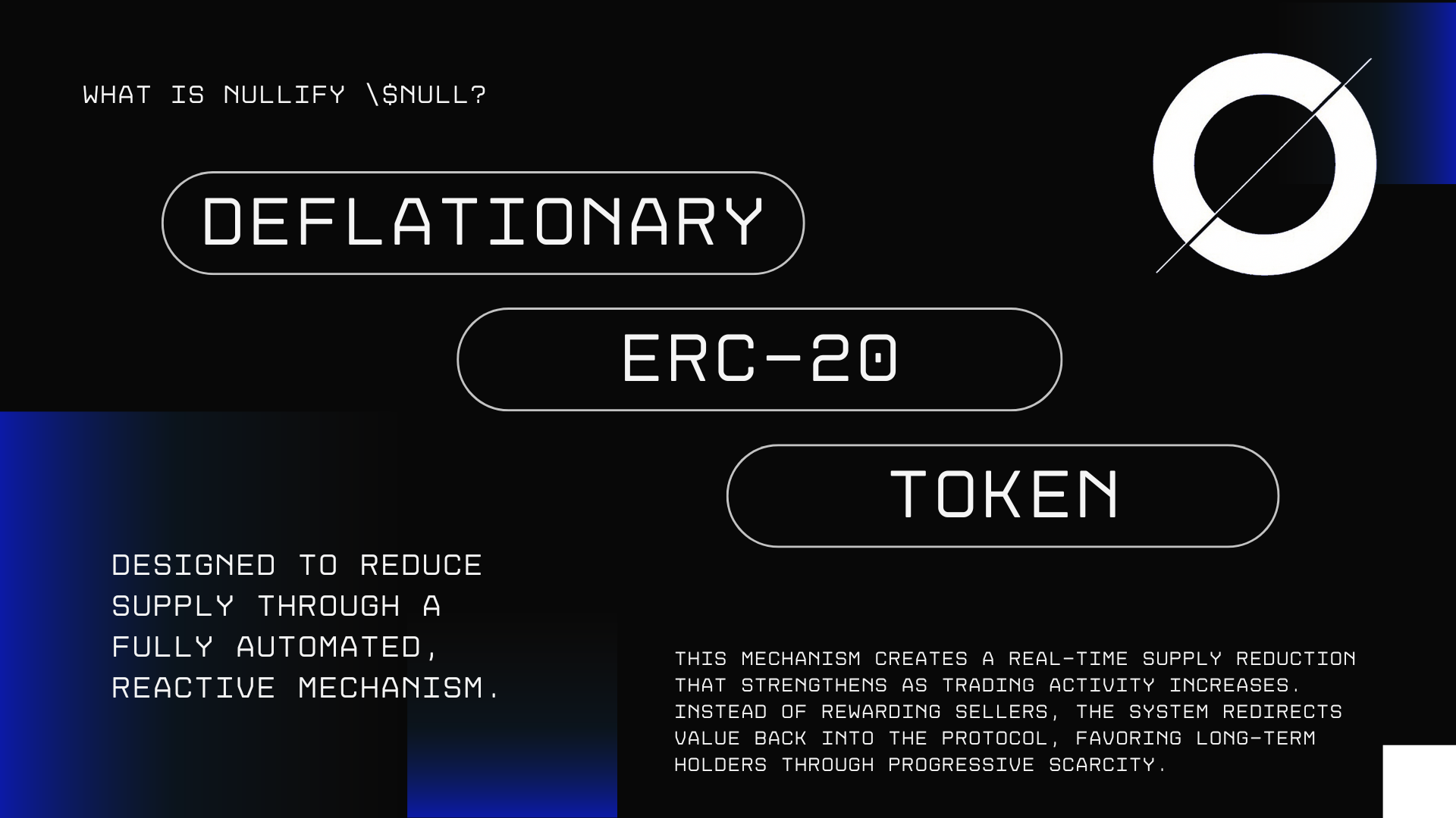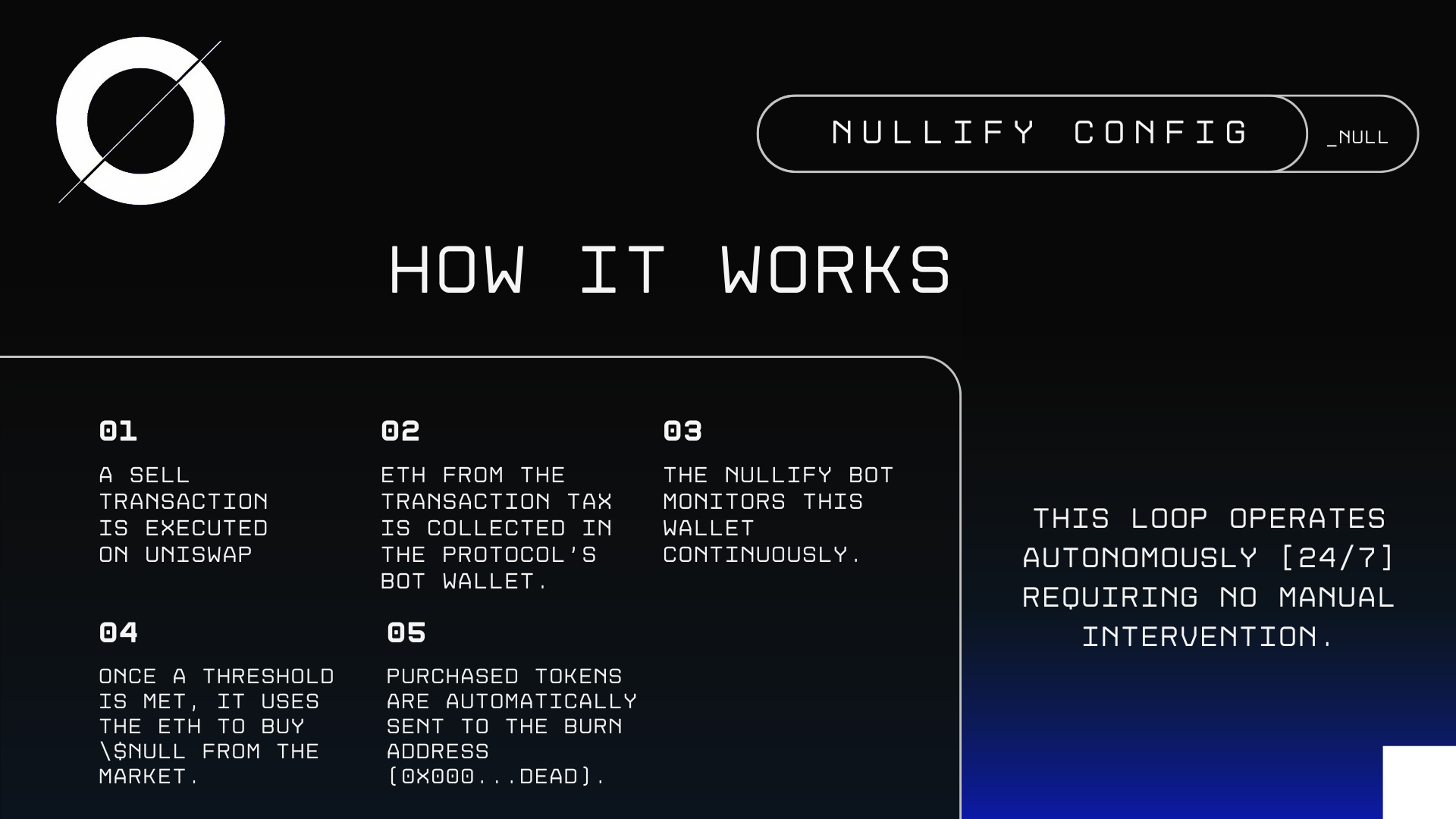 Nullify $NULL is a revolutionary token powered by an innovative buyback bot that automatically counters every sell with a buy, stabilizing value and rewarding holders. Our sophisticated bot dynamically responds to market activity, ensuring resilience against sell-offs.